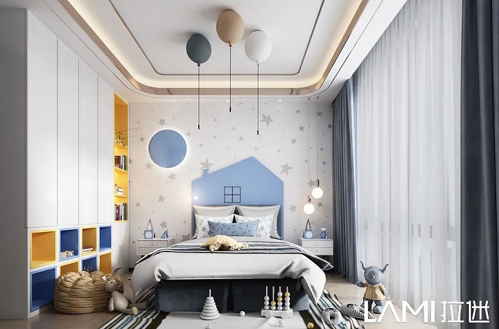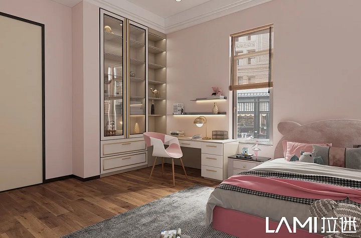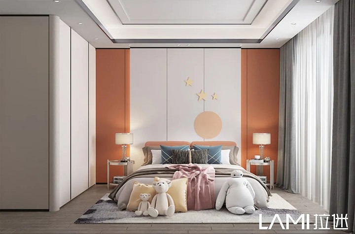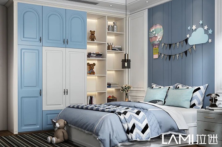 兒童房色彩搭配,拉迷一般采用幾款最接近大自然的板材:佩羅柏木、布格拉灰、伊麗莎白、絨面水藍等,色彩明亮、自然,對孩子的視力可以起到舒緩、放松。