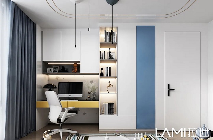 拉迷一直致力于兒童房空間定制的設計研發,兒童房與其它空間有所不同的是,它對色彩、燈光、布局和板材等諸多細節有挑剔的要求,而且從小學開始,小朋友的寫字桌永遠堆滿了東西——儲物和學習空間混在一起,小朋友還經常理直氣壯弄不明白——既然明天還要用,今天為什么還要收起來?