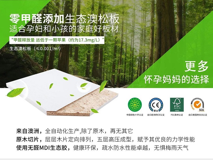 澳松板環(huán)保等級非常高,是唯一一個通過了澳大利亞、新西蘭和日本三國聯(lián)合認(rèn)證的板材。它是將新鮮的澳洲松木打成纖維,七天內(nèi)完成所有工藝制成成板,否則的話木質(zhì)纖維會產(chǎn)生藍(lán)變反應(yīng),整個變藍(lán)。所以說他的成品制作周期非常的短,要求同時也很高,最新鮮的木材保證了他的環(huán)保等級更健康、更安全,大人孩子安心入眠。