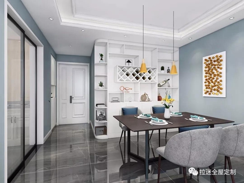 餐邊柜在設(shè)計(jì)時(shí)將酒柜結(jié)合其中,既滿足了餐邊柜的儲(chǔ)物功能,也滿足了酒柜的展示功能。而穿插酒柜的設(shè)計(jì)更是將主人毫無(wú)張揚(yáng)之態(tài),又不失自信之姿的品質(zhì)表達(dá)的淋漓盡致。