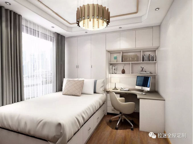 結合戶型和采光來判斷書桌的朝向以后,你就可以確定將組合式柜體放在床頭還是床尾。L型的布局方式可以更好地完成衣物、書籍和零碎物品的收納,還能提高整體空間的利用率,塑造簡潔干凈的空間感。