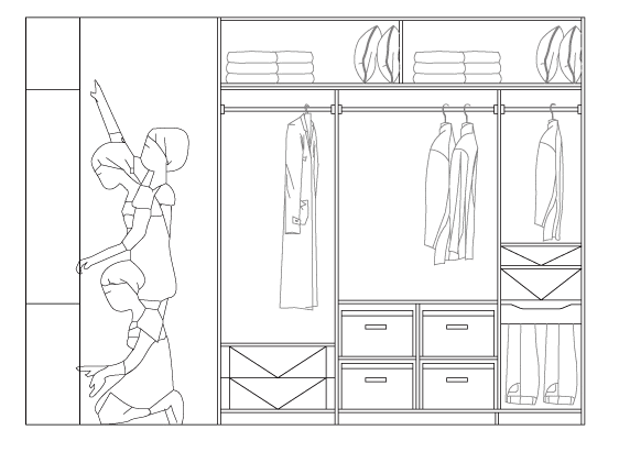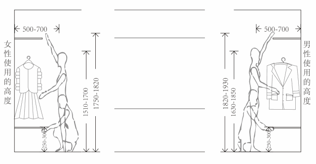 由上圖可以分析出我們設計衣柜時必須考慮的三點,第一點使用的頻率、第二點收納物品的重量、第三點人體工程學,結合這三點的我們可以將衣柜分為三個不同的區域。