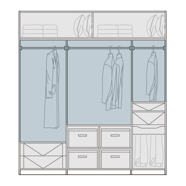 中層區:中層區是存取物品最為方便的高度,這一層可放置掛一桿,根據衣服的長度再繼續長短分區。