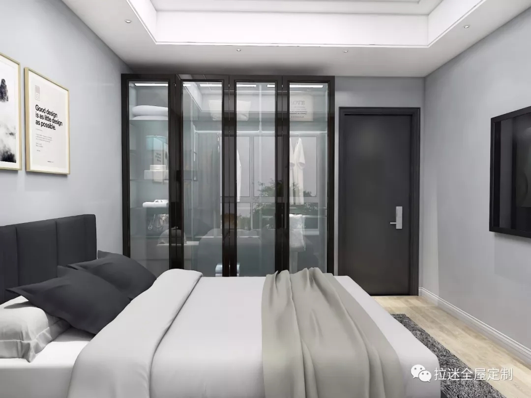 兩個臥室采用了不同的衣柜設計。一個以封閉式為主,另一個則是開放式為主,還加入了電視柜。