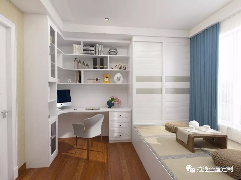 如果你希望安裝榻榻米的這間房既可以當臥房又可以當書房,可以選擇在榻榻米床頭或者床尾安裝衣柜、書架和書桌,這樣不僅可以收納衣物,也可以收納書架用來辦公,一舉多得。