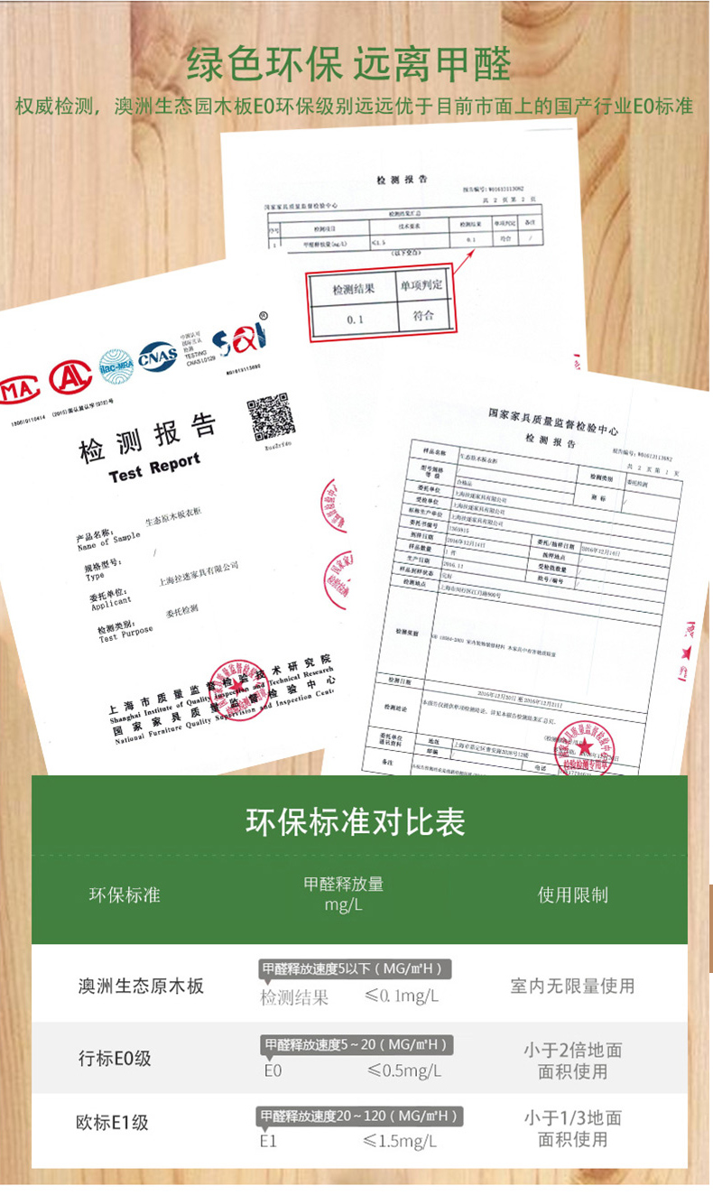 我樂家居產品出眾的環保性能有口皆碑,采用“E0”級環保板材,其甲醛釋放量≤0.06mg/m3,